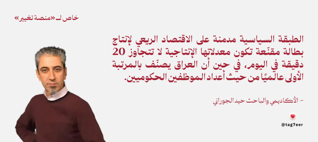 في حين أكد الباحث والأكاديمي حيدر الجوراني أن التوظيف الزبائني يمثل “وسيلة لإعادة إنتاج منظومة الأحزاب التقليدية لنفسها، وذلك لأنها عجزت عن خلق قواعد جماهيرية لإيديولوجيتها منذ تغيير النظام 2003، إضافة إلى عدم امتلاكها منذ ذلك الحين رؤية تنموية تحقق نقلة نوعية في الاقتصاد العراقي الريعي”. مشيرًا إلى أنه ونتيجة لذلك، تكون الطبقة السياسية التقليدية في “حالة إدمان على الاقتصاد الريعي لتغطية موازنات تشغيلية لبطالة مقنّعة تكاد تكون معدلاتها الإنتاجية لا تتجاوز 20 دقيقة في اليوم الواحد، في حين أن العراق يصنّف بالمرتبة الأولى عالميًا من حيث أعداد الموظفين الحكوميين”.