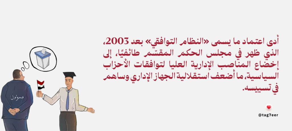 أدى اعتماد ما يسمى «النظام التوافقي» بعد 2003، الذي ظهر في مجلس الحكم المقسّم طائفيًا، إلى إخضاع المناصب الإدارية العليا لتوافقات الأحزاب السياسية، ما أضعف استقلالية الجهاز الإداري وساهم في تسييسه. هذا التسييس أتاح لتلك الأحزاب توزيع المناصب والوظائف الأخرى على أساس الولاء والطائفة، ورسّخ ذلك التوظيف الزبائني كأداة لإعادة توزيع السلطة والموارد. وتؤكد الدراسات أن التوسع غير المستدام في رواتب القطاع العام في العراق اعتمد على المحسوبية السياسية من جهة، وحاجة المواطنين إلى فرص عمل من جهة أخرى، ليكون أهم ما ينتج عنه:
