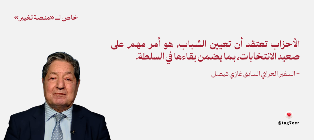 قال السفير العراقي غازي فيصل إن “المعايير الحزبية والمحاصصة الحزبية والطائفية هي التي تُوزع على أساسها المناصب، سواء على صعيد الوزارات أو الدرجات الأولى أو الخارجية، كالسفراء والدبلوماسيين، وكذلك القوات المسلحة والقبول فيها واختصاصاتها المختلفة، والأجهزة الأمنية”. فيما أشار إلى أن ذلك ” يمر عبر الأحزاب، لأنها تعتقد أن تعيين الشباب، هو أمر مهم على صعيد الانتخابات، بما يضمن بقاءها في السلطة، رغم مختلف المشاكل الكبرى الاقتصادية والسياسية والاجتماعية في البلد، مثل انتشار الجريمة، والمخدرات، وتبييض الأموال، والشركات الوهمية، والعقود الوهمية، ومختلف المظاهر السلبية الخطيرة”.