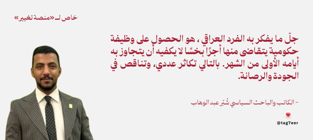 ويرى الباحث شُبّر عبد الوهاب أن “السلطة في العراق أدركت أن أحد أهم أسس بقائها طويًلا في الحكم هو بتوسيع شبكاتها الزبائنية في مؤسسات الدولة، ولهذا نجد اليوم رغبة الفرد العراقي وطموحه لا أن يرتقي بواقعه المعيشي أو أن ينظر إلى تجارب الدول التي تحيطه، في مستوى الرفاهية، بل جلّ ما يفكر به، هو الحصول على وظيفة حكومية يتقاضى منها أجرًا بخسًا لا يكفيه أن يتجاوز به أيامه الأولى من الشهر”. وتابع القول، “لذلك أصبح الموظفون ضمن الشبكات الزبائنية بآلاف، بالتالي تكاثر عددي، وتناقص في الجودة والرصانة”.