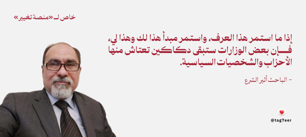 وبشأن الكفاءات قال الشرع إن “أصحاب الشهادات من التكنوقراط المختصين، ممن ليس له جهة سياسية تدعمه، لا يتم تعيينه، إلا في حالات نادرة واستثنائية. لا توجد إرادة حقيقية لتعيين الكفاءات، بسبب الدواعي الانتخابية وما يُسمى بالاستحقاق الانتخابي أو السياسي، وهو ما يمثل طامة كبرى، فالعرف السائد في العراق هو التوافق، وإذا ما استمر هذا العرف، واستمر مبدأ هذا لك وهذا لي، فإن بعض الوزارات ستبقى دكاكين تعتاش منها الأحزاب والشخصيات السياسية”. ويوضح الشرع أنه “عندما يتم اختيار وزير معين، يُؤخذ منه صراحة تعهد بأنه سيعمل ضمن توجهات الحزب أو الكتلة أو الجهة التي أتت به، وكذلك الأمر بالنسبة لتعيين وكلاء الوزراء، وحتى في الدرجات الوظيفية الأخرى، الأمر الذي لا يُنتج كفاءة ولا يُولّد حرصًا على مصلحة العراق، بل يولد حرصًا على الحزب أو الكتلة أو الجهة السياسية، وإذا استمرت التعيينات بهذه الطريقة، وبهذه المجاملات وعلى حساب الشعب العراقي، فإن هناك انهيارًا كارثيًا للدولة العراقية خلال السنوات القادمة”.
