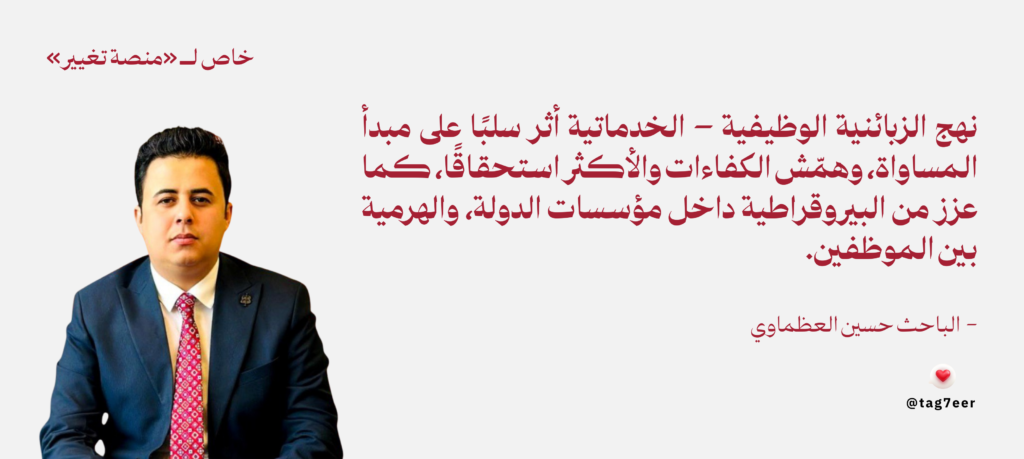 في السياق ذاته، قال الباحث حسين العظماوي إن “الزبائنية الوظيفية – الخدماتية، أسهمت في تعزيز نفوذ بعض القوى السياسية، وانعكس ذلك بشكل مصلحي على وضعها في الانتخابات”. وبحسب العظماوي فإن هذا النهج أثر “سلبًا على مبدأ المساواة، ويسهم في تهميش الكفاءات والمختصين والأكثر استحقاقًا، كما يعزز من البيروقراطية داخل مؤسسات الدولة، ويخلق تفاوتًا وهرمية بين موظفي الدولة”.