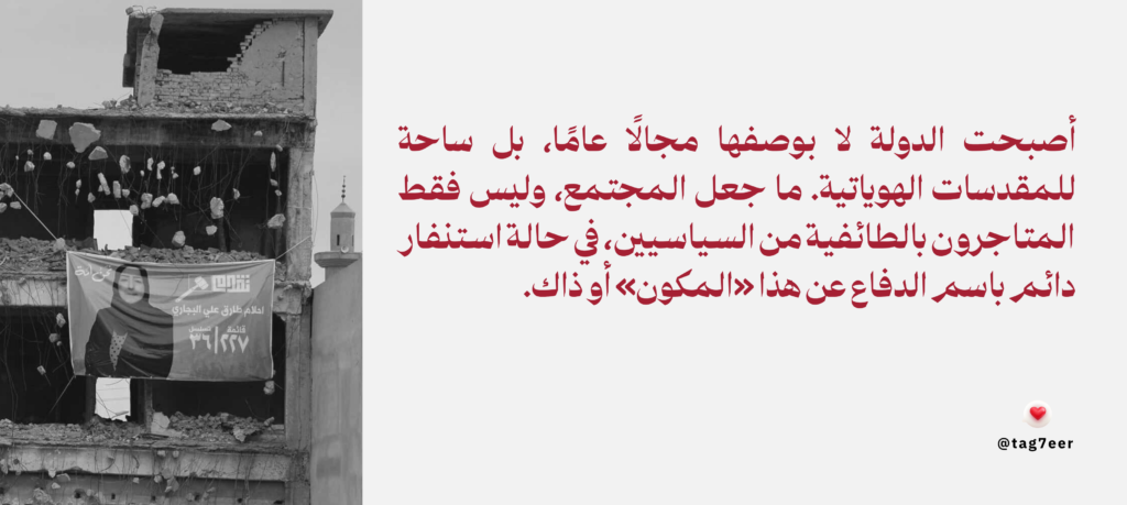 بعد عقود من «الديمقراطية»، أصبحت الدولة لا بوصفها مجالًا عامًا، بل ساحة للمقدسات الهوياتية. ما جعل المجتمع، وليس فقط المتاجرون بالطائفية من السياسيين، في حالة استنفار دائم باسم الدفاع عن هذا «المكون» أو ذاك. وبعيدًا عن الحلول السحرية، إلا أن الحاجة الملحّة تبرز في تجاوز هذه البنية -في الحديث عن التغيير- نحو عقلانية مدنية تقوم على المواطنة، لا هيمنة القداسة الزائفة.