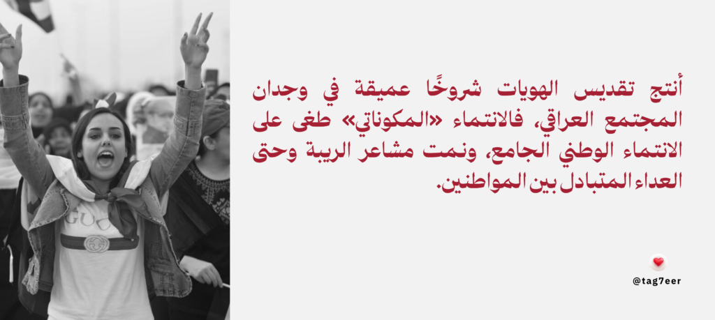 أنتج تقديس الهويات شروخًا عميقة في وجدان المجتمع العراقي، فالانتماء «المكوناتي» طغى على الانتماء الوطني الجامع، ونمت مشاعر الريبة وحتى العداء المتبادل بين المواطنين. وصار كل طرف ينظر إلى الآخر كخصم محتمل أو خطر كامن، تغذّيه سرديّات تاريخية وأحقاد مفتعلة. ما قوض -هذا التشظّي- أسس الثقة ومشروع بناء الدولة، ودفع بالكثيرين إلى الانكفاء داخل حدود الهوية الضيقة طلبًا لأمانٍ موهوم.