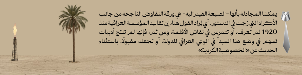2- الهدف ليس اختزال الفيدرالية في عامل واحد أو فاعل واحد، ولا إلى تجاهل أدوار قوى شيعية أو تأثير السياق الدولي. إنما الإشارة إلى اختلال ميزان القوة التفاوضية أثناء صياغة الدستور، حيث امتلك المشروع الكردي تصورًا واضحًا ومتماسكًا للفيدرالية، مقارنة ببقية الفاعلين الذين تعاملوا معها إما بوصفها ضمانة ظرفية أو خطرًا محتملًا. ومن ثم، فالفيدرالية لم تنشأ بوصفها نتيجة نقاش مؤسسي عراقي راسخ، بل تسوية سياسية غير متكافئة. وسرعان ما انقلبت عليها الأحزاب الشيعية، ويمكننا أن نرى ذلك في العلاقة المتوترة بين بغداد وأربيل.