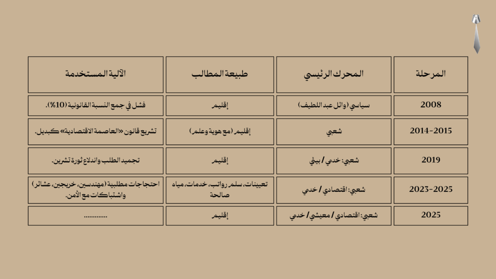 4- أظهرت المراحل المتعاقبة لمطالبات إقليم البصرة تحولًا واضحًا من مبادرات سياسية إلى حراك شعبي، ثم إلى ردود فعل على أزمات خدمية وبيئية، وصولًا إلى مطالب اقتصادية مباشرة، ما يعكس تآكل الخطاب الهوياتي (لا سميا أن السياق الحالي يأتي بعد «نجاح الانتخابات» التي تعكس «إرادة العراقيين»!).