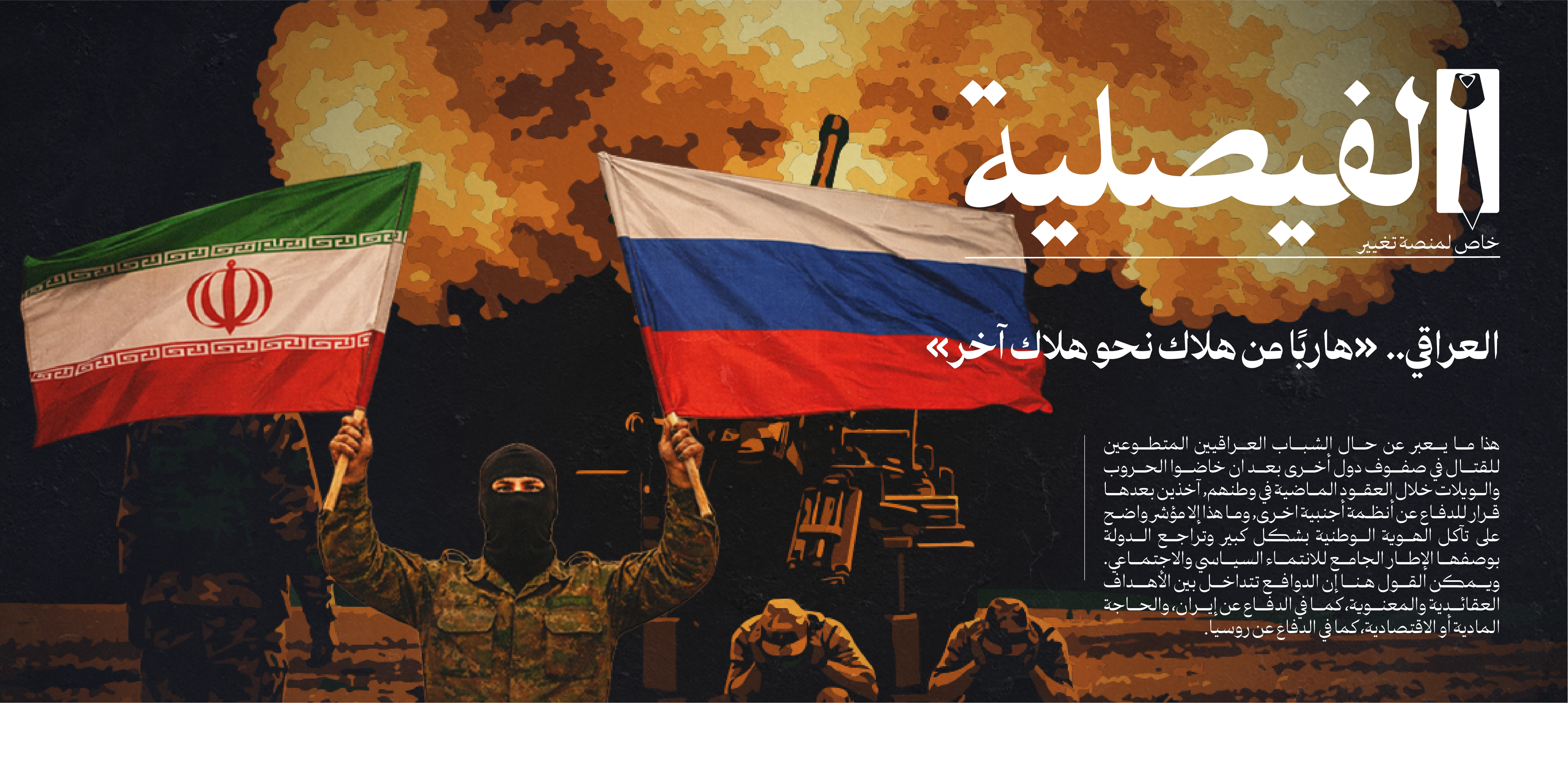 «هاربًا من هلاك نحو هلاك آخر»، هذا ما يعبّر عن حال الشباب العراقيين المتطوعين للقتال في صفوف دول أخرى بعد أن خاضوا الحروب والويلات خلال العقود الماضية في وطنهم، آخذين بعدها قرار الدفاع عن أنظمة أجنبية، وما هذا إلا مؤشر واضح على تآكل الهوية الوطنية بشكل كبير وتراجع الدولة بوصفها الإطار الجامع للانتماء السياسي والاجتماعي. ويمكن القول هنا، إن الدوافع تتداخل بين الأهداف العقائدية والمعنوية، كما في الدفاع عن إيران، والحاجة المادية أو الاقتصادية، كما في الدفاع عن روسيا. وإذا نظرنا إلى الجهات الفاعلة، نجد أن بعضها، بما فيها الفصائلية، تقوم بنشر ما تسمّيه بـ «المتطوعين»، وترعاهم، وتستغلهم كأداة للتعبير عن نفوذها في الساحة الدولية.