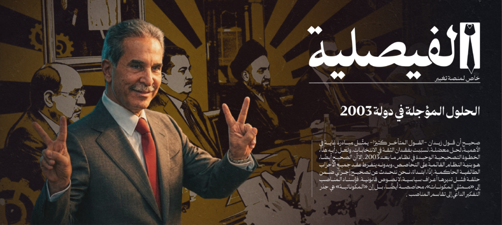 لماذا الفيصلية؟ فائق زيدان وإشكالية الحكومات.. لماذا ندور مع حلقة الفشل؟ إبراهيم فاضل - الفيصلية 4 آذار 2026 المحتوى كامل عراق اللحظة الحرجة: ولاية المالكي تعجّل انهيار المنظومة منصة تغيير - الفيصلية 20 شباط 2026 المحتوى كامل «الجنود المرتزقة».. لماذا يقاتل العراقيون نيابة عن أنظمة أجنبية؟ نبراس علي - الفيصلية 15 شباط 2026 المحتوى كامل هل سيصلح باراك ما «أفسده» سافايا في العراق؟ نبراس علي - الفيصلية 8 شباط 2026 المحتوى كامل ترمب يهدد والمالكي يتمسك بالترشح.. من سيكون صاحب القرار؟ نبراس علي - الفيصلية 29 كانون الأول 2026 المحتوى كامل المالكي بين الرفض الحزبي وغياب المعارضة الوطنية منصة تغيير - الفيصلية 25 كانون الثاني 2025 المحتوى كامل «إقليم البصرة» والسياق العراقي: لماذا تتكرر الفكرة؟ إبراهيم فاضل - الفيصلية 20 كانون الأول 2025 المحتوى كامل جدل المساس بشرعية النظام: عن الخوف من «أمن سياسي» جديد! منصة تغيير - الفيصلية 12 كانون الأول 2025 المحتوى كامل تحديث المحاصصة: هل يوجد طائفي كفوء؟ إبراهيم فاضل - الفيصلية 15 تشرين الثاني 2025 المحتوى كامل سجاد سالم وسردية «الشيعي الوطني» إبراهيم فاضل - الفيصلية 11 تشرين الأول 2025 المحتوى كامل احتفال بالفراغ الوطني.. «وطن مصطنع و دولة مكونات» إبراهيم فاضل - الفيصلية 2 تشرين الأول 2025 المحتوى كامل الثقافة الانتخابية في العراق: عشائر وغيبيات منصة تغيير - الفيصلية 24 أيلول 2025 المحتوى كامل من داخل اللعبة: «الساحة السنية» ذراعًا أيمن للنظام «المكوناتي» إبراهيم فاضل - الفيصلية 27 آب 2025 المحتوى كامل لماذا انتزع العراقيون الشرعية من النظام؟ منصة تغيير- الفيصلية 19 آب 2025 المحتوى كامل الكثير من «البلطجة» والقليل من السياسة إبراهيم فاضل - الفيصلية 15 آب 2025 المحتوى كامل كيف أصبحت الذاكرة وسيلة لانقسام العراقيين؟ منصة تغيير - الفيصلية 14 تموز 2025 المحتوى كامل كيف أغلقت «السياسة المقدسة» نوافذ التغيير في العراق؟ منصة تغيير - الفيصلية 3 تموز 2025 المحتوى كامل التخوين الممنهج: ثقافة سياسية في عراق ما بعد 2003 منصة تغيير - الفيصلية 4 أيار 2025 المحتوى كامل الزبائنية ومؤسسات الدولة: رحلة السقوط البطيء منصة تغيير - الفيصلية 28 نيسان 2025 المحتوى كامل هل استُبعد العراق من المفاوضات خوفًا من تسريب الأسرار؟ سيف رعد طالب - الفيصلية 17 نيسان 2025 المحتوى كامل الزهايمر السياسي والهروب من المركزية.. كيف فشلت دولة 2003؟ إبراهيم فاضل - الفيصلية 28 آذار 2025 المحتوى كامل النفط شيعي ودجلة والفرات سنة.. لا حدود للطائفية في عراق 2003 منصة تغيير - الفيصلية 25 آذار 2025 المحتوى كامل تحليل موجز: هل أصبح العراق بؤرة لتصدير الطائفية إلى المنطقة؟ منصة تغيير - الفيصلية 15 آذار 2025 المحتوى كامل متى يصبح الانتخاب «خيانة عظمى»؟ منصة تغيير - الفيصلية 23 شباط 2025 المحتوى كامل العراق: السقوط في الماء أم في النار؟ نبراس علي - الفيصلية المحتوى كامل صناعة الرمزية الشعبوية: من أبو عزرائيل إلى مصطفى سند محمد رجا - الفيصلية المحتوى كامل كيف أرعب «جو ويلسون» ساسة العراق؟ نبراس علي - الفيصلية العراق في عين العاصفة المحتوى كامل الجيش العراقي بين الهجمات الإعلامية ومحاولات الإضعاف محمد رجا - الفيصلية المحتوى كامل فارس حرّام يحذر: القراءات المتناقضة للتاريخ هي وقود للطائفية فارس حرّام - الفيصلية التاريخ الممزق بين الطوائف المحتوى كامل هل بات الاستثمار الطائفي ينفع؟ منصة تغيير - الفيصلية قراءة معمّقة في سياسة القوى المحتوى كامل الصراف وأحاديث سياسية: بغداد لا يحكمها العراقيون! حامد الصراف - الفيصلية طبقة سياسية طفيلية المحتوى كامل أيام قليلة ويحدث التغيير! الفيصلية - منصة تغيير التغيير يحوم حول العراق المحتوى كامل الذاكرة التشرينية: حراك ينضج في وجه السلطة إبراهيم فاضل - منصة تغيير تشرين 2019: عودة أخرى بلا خيام المحتوى كامل عراق 2025.. هل ينقذ المستقبل ما أفسده الحاضر؟ الفيصلية - منصة تغيير أخطاء 2024 ومخاوف 2025 المحتوى كامل القوى الوطنية جاهزة و